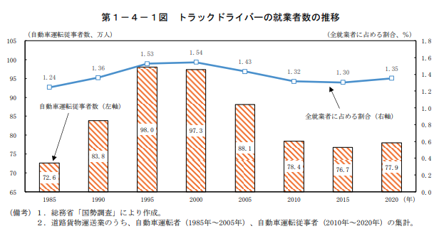 内閣府「(補論)物流業の人手不足問題」に掲載されているデータによると、2000年には97.3万人いたトラックドライバーですが、2020年には77.9万人と、20年間で約20万人も減少しています。