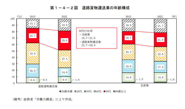 データもそれを明らかにしており、年齢構成において全産業平均に比べ50代の占める割合が早いペースで上昇しています。