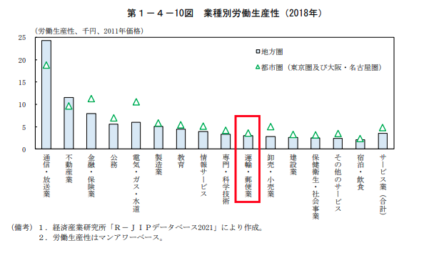 内閣府「(補論)物流業の人手不足問題」内の以下の表を見ればわかるように、物流業界が該当する運輸業・郵便業は、製造業などに比べて労働生産性が低い産業であることがわかります。