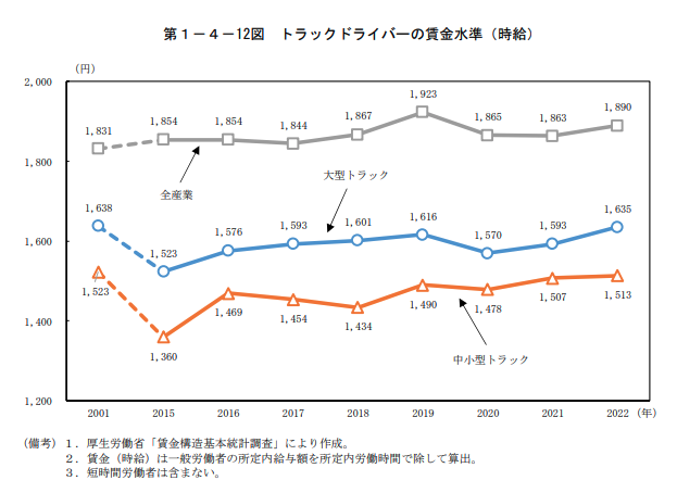 内閣府「(補論)物流業の人手不足問題」によれば、トラックドライバーの年間所得額は、全産業平均と比較して低い水準で推移しています。