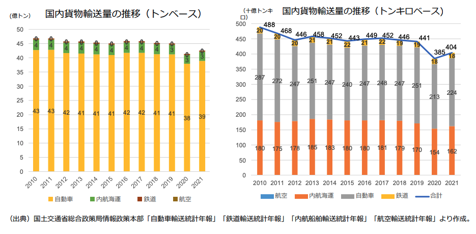 上記の表から、トンベースで見ると圧倒的なシェアを誇る「自動車(トラック)」ですが、距離を掛け合わせたトンキロベースで見ると、船舶や鉄道の役割が大きくなることがわかります。