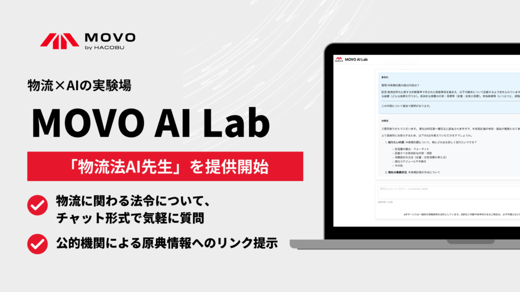 物流効率化法など法改正への対応に追われる企業が増えています。Hacobuが提供するMOVOシリーズの物流法AI先生は、RAG(検索拡張生成)技術を活用し、物流関連法令に関する質問にチャット形式で回答します。