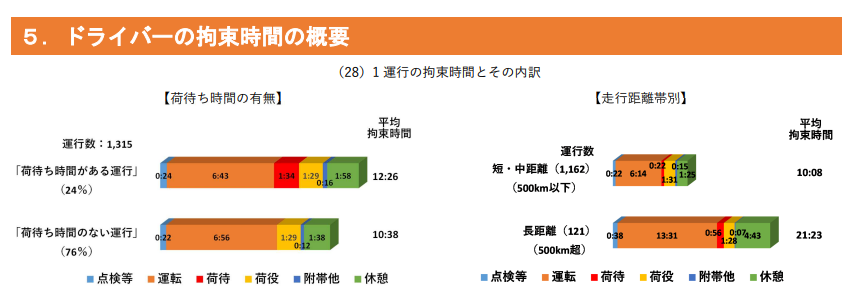 国土交通省「トラック輸送状況の実態調査結果(概要版)」では、短・中距離(500km以下)の1運行あたりの拘束時間(平均10時間8分)の内訳として、荷役に1時間31分、その他の付帯作業に15分が示されており、合計すると1時間46分が荷役・付帯作業に充てられていることになります。