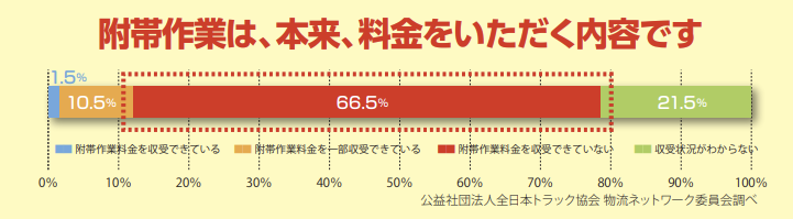 全日本トラック協会の調査によれば、運送事業者の66.5%が付帯作業料金を収受できていないと回答しています。付帯作業は本来、運送とは別に料金を収受すべき役務ですが、実際にはその対価が支払われないまま現場対応が常態化している実態がうかがえます。こうした状況は運送事業者の収益を圧迫し、ドライバーの処遇改善や人材確保を妨げる要因にもなっています。