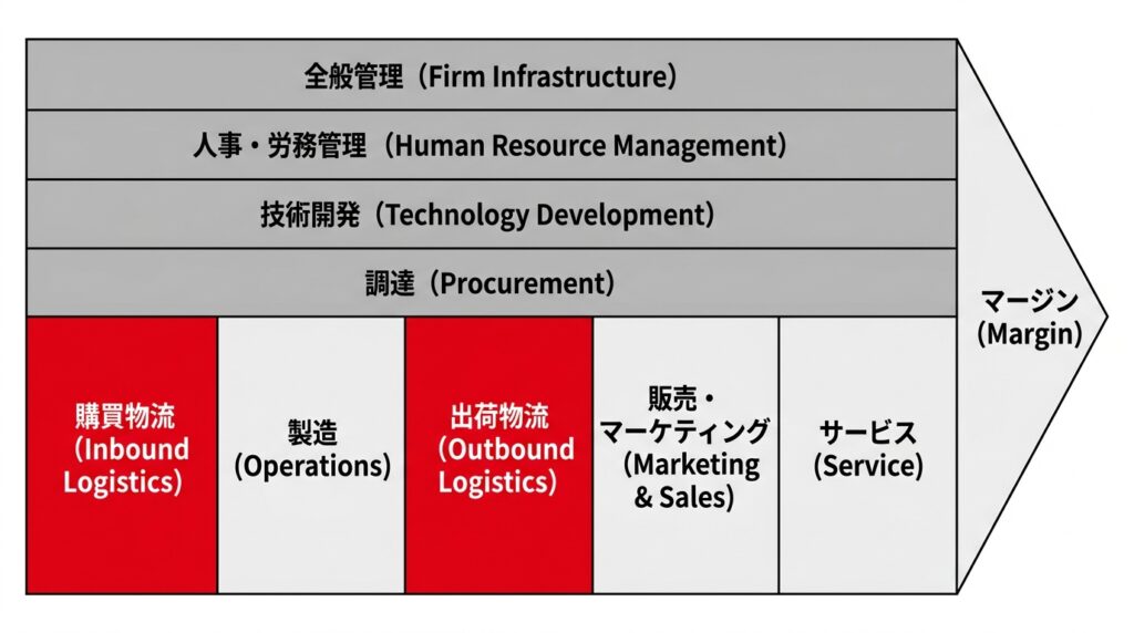 ここで注目したいのは、「購買物流」と「出荷物流」が、主活動に明確に含まれていることです。つまりポーターのフレームワークにおいても、物流は「コストではなく価値を生む活動」として位置づけられているのです。