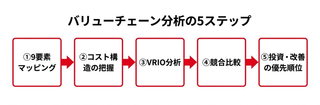 - 9要素マッピング→コスト把握→VRIO→競合比較→優先順位付けの5段階