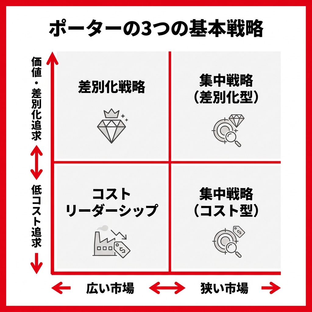 バリューチェーン分析は、「よく見えた」で終わらせては意味がありません。分析結果を競争戦略に結びつけて初めて、経営が動きます。ここで参照したいのが、マイケル・ポーターが提唱した3つの基本戦略(Generic Strategies)です。