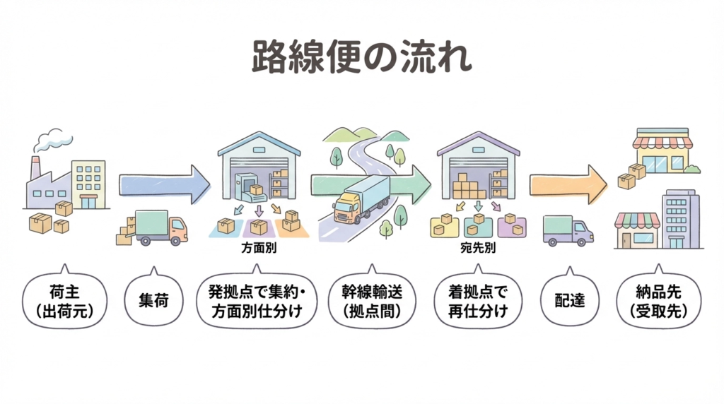 路線便はまず、荷主から集荷した貨物を最寄りの拠点に集約します。次に拠点で配送エリアごとに仕分けし、同一方面の貨物をまとめて幹線便に積載して着拠点へ運びます。着拠点では住所や納品先別に再度仕分けを行い、各納品先へ配達されます。拠点を介した中継輸送を前提に設計されているため、輸送の効率化とコスト平準化がしやすい仕組みです。