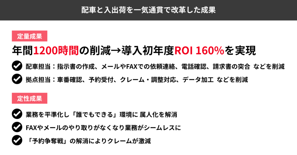松本様:導入前に効果試算を行っていましたが、実際にはそれを上回る成果が出ました。MOVO Vistaで管理している配車情報が、MOVO Berthに連携され予約受付までシームレスに情報が連携される。配車情報伝達のシームレス化によって年間約1,200時間の業務時間創出につながり、初年度でROI160%超を実現できました。「検討段階で完璧なROIを求めるのは難しい」という声もありましたが、実際に運用してみることで、想定以上の効果を数字で示すことができました。細かく定量化してみると、年間でそれだけの時間を情報伝達に割いていたことに驚きもありました。