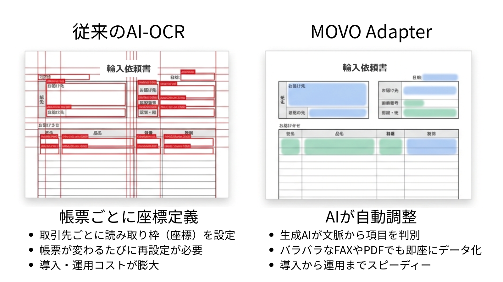 従来のAI-OCRは帳票ごとに座標定義が必要で、書式が変わるたびに再設定が発生。