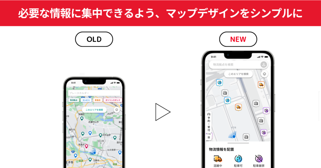 さらにデザインを刷新したことで、必要な情報を直感的に捉えやすくなり、運行中の地図確認もスムーズになりました。これにより、待機場所やルートの把握が容易になり、ドライバーの業務効率向上に貢献します。