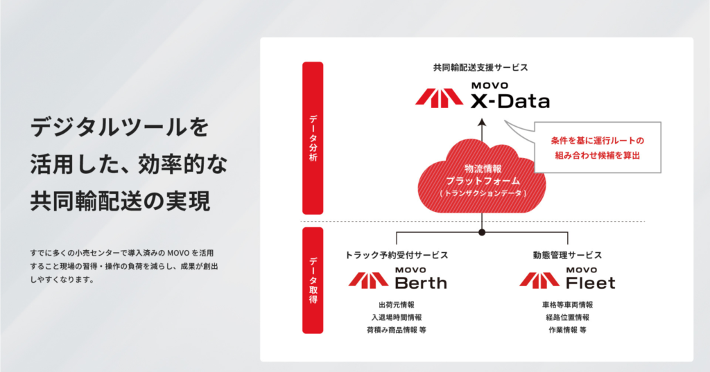 具体的には、トラック予約受付サービス「MOVO Berth(ムーボ・バース)」に蓄積された入出荷時間や拠点情報、動態管理サービス「MOVO Fleet(ムーボ・フリート)」に蓄積された経路や車格(車両サイズ)などのデータを、共同輸配送支援サービス「MOVO X-Data(ムーボ・クロスデータ)」で統合・分析します。これにより、膨大な候補の中から効率的に実現可能な輸配送パターンを導き出します。