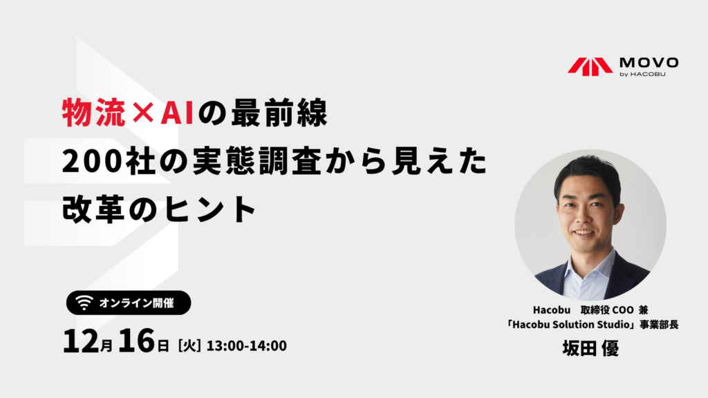 本調査をもとに、物流領域におけるAI活用の最新動向と、実装フェーズに進むための具体的なステップを、豊富な事例を交えながら分かりやすく解説します。登壇者は、Hacobu 取締役COOであり、システムインテグレーション・AI導入支援「Hacobu Solution Studio」を率いる坂田 優です。
