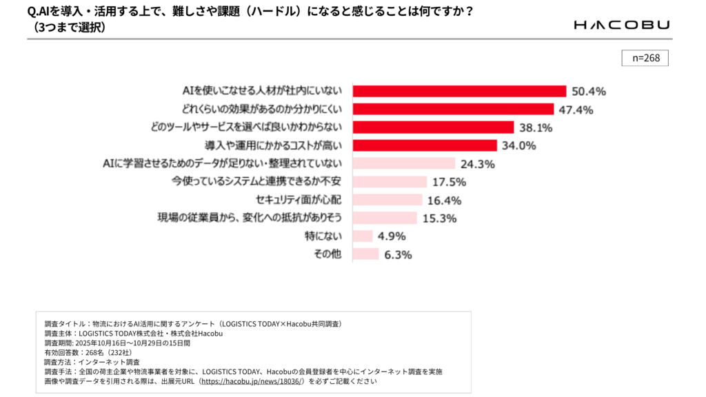 ・導入の壁は「AIを使いこなせる人材がいない(50.4%)」「効果が見えにくい(47.4%)」。