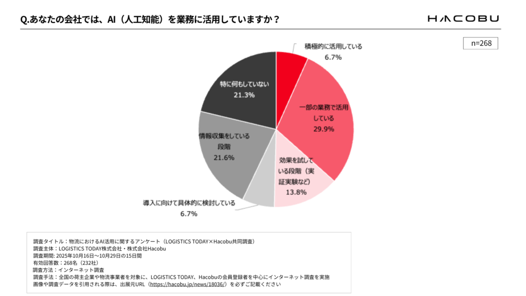 LOGISTICS TODAY×Hacobu共同調査:AI活用企業は3割、導入意欲は9割超。人材と実装が壁