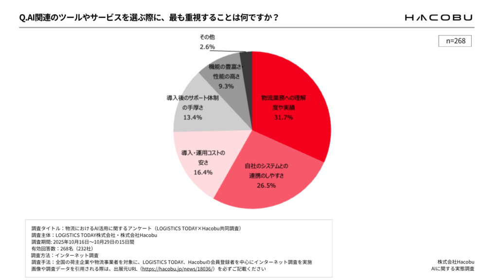 AI関連のツールやサービスを選ぶ際に最も重視する点について質問したところ、「物流業務への理解度や実績(31.7%)」が最多となった。AI活用においては、物流業務や現場への理解・実績が最重要視されている。