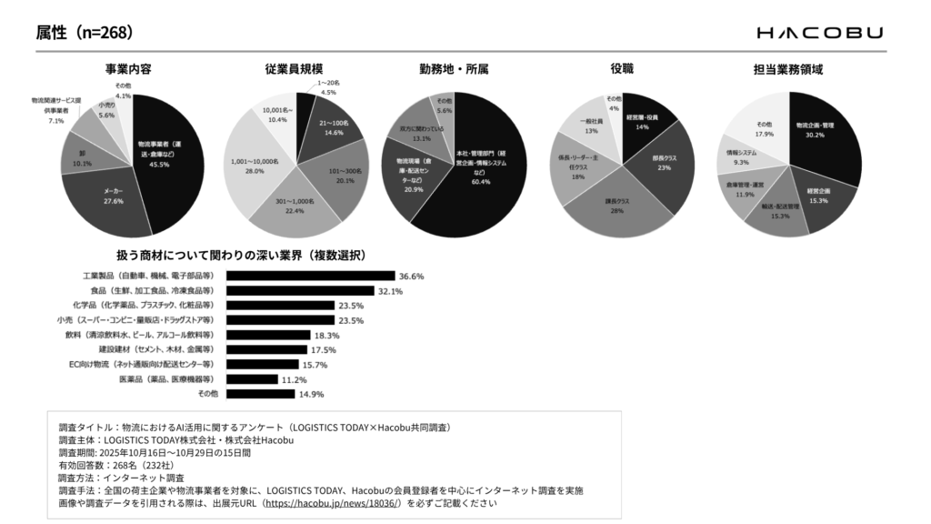 データの力で物流課題を解決する株式会社Hacobuは、物流ニュースサイト『LOGISTICS TODAY』と共同で、全国の荷主企業・物流事業者232社・268名を対象に「物流×AIに関する共同調査」を実施し、この度、本調査結果をまとめたリポートを発行したことをお知らせします。