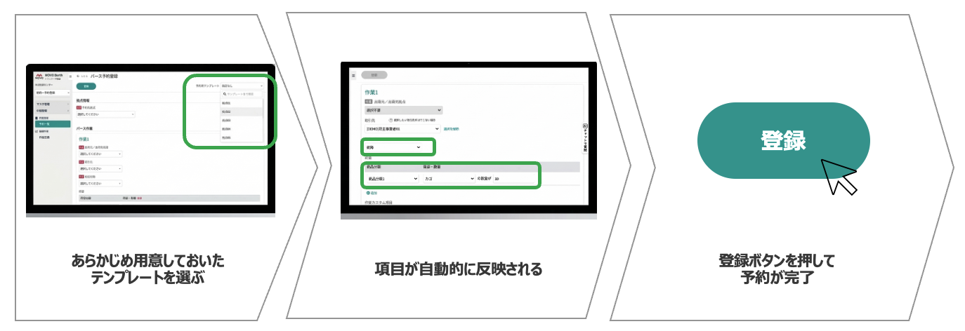 拠点・バース・品目・物量・時間帯など、予約フォームの内容をテンプレートとして保存できます。「○○センター向け定期便」「△△荷主向け週次便」など、業務パターンごとに名前をつけて管理できるため、予約件数が増えても一覧から選ぶだけで対応できます。