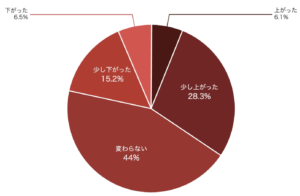 「変わらない(44%)」、「少し下がった(15.2%)」、「下がった(6.5%)」の合計が6割以上で、賃金が上がった実感を持てない層が中心となりました。