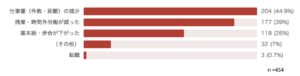 収入が減少した理由として最も多かったのは「仕事量(件数・距離)の減少(44.9%)」、次いで「残業・時間外労働が減った(39%)」となりました。