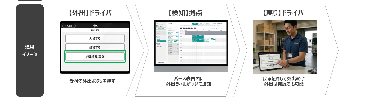 ドライバーが拠点の受付端末(iPad等)で「外出する」「戻る」を操作すると、物流拠点側の担当者が見る「バース表」の上で、即座に「外出」表示へ切り替わります。現場担当者は複数のドライバーの状態を一覧で見ながら、次の車両の誘導や作業指示を判断できます。